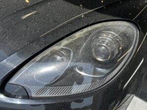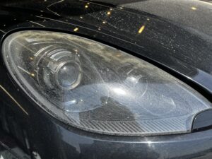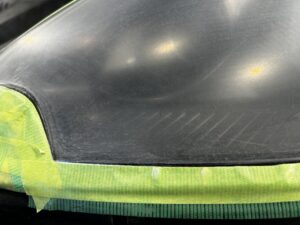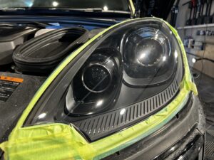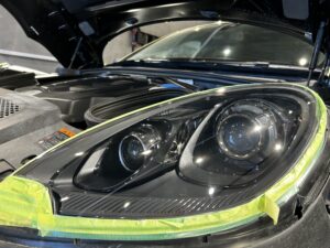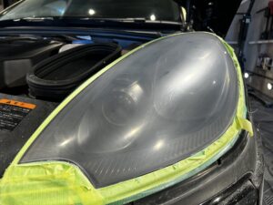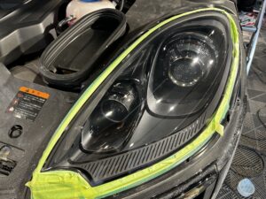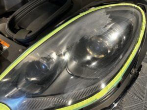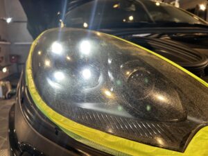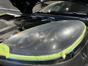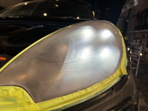 マスキングテープ等で養生行い、ヘッドライトの光の反射で